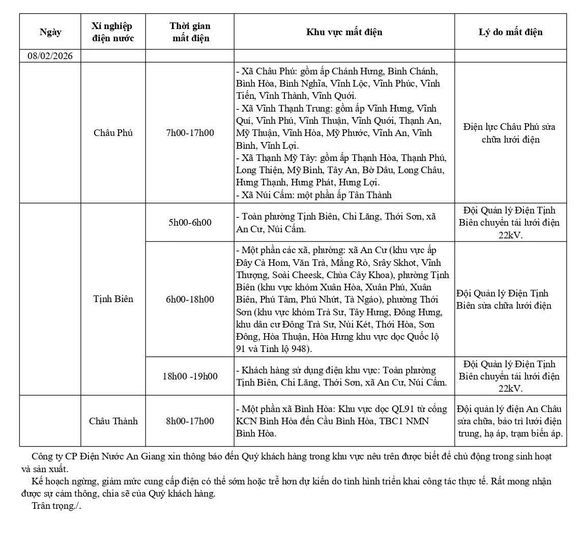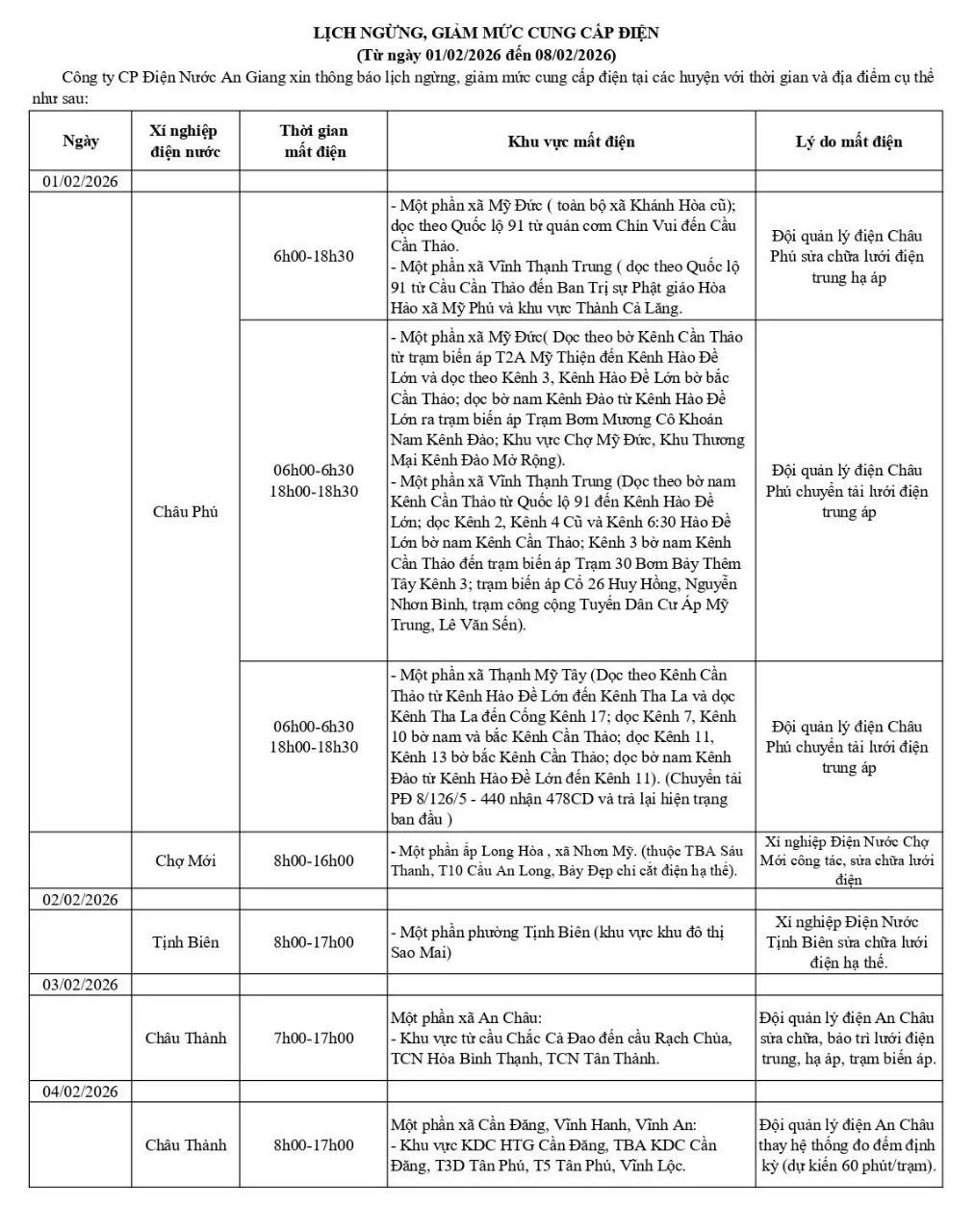 Thông báo lịch ngừng, giảm mức cung cấp điện (Từ ngày 01/02/2026 đến ngày 08/02/2026)