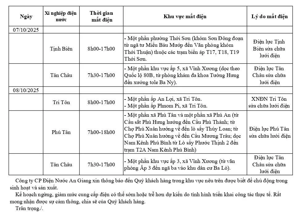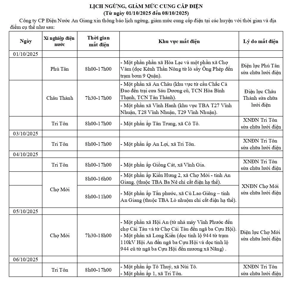 Thông báo lịch ngừng, giảm mức cung cấp điện (Từ ngày 01/10/2025 đến ngày 08/10/2025)