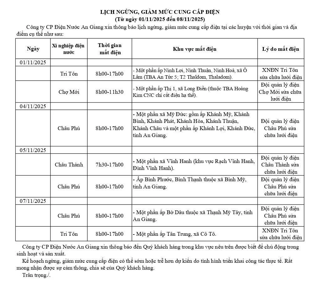 Thông báo lịch ngừng, giảm mức cung cấp điện (Từ ngày 01/11/2025 đến ngày 08/11/2025)