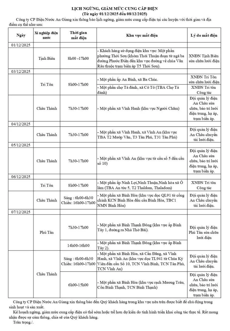 Thông báo lịch ngừng, giảm mức cung cấp điện (Từ ngày 01/12/2025 đến ngày 08/12/2025)
