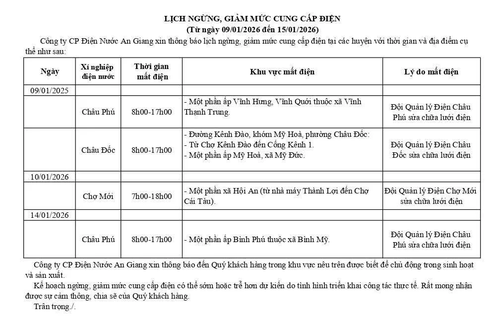Thông báo lịch ngừng, giảm mức cung cấp điện (Từ ngày 09/01/2026 đến ngày 15/01/2026)
