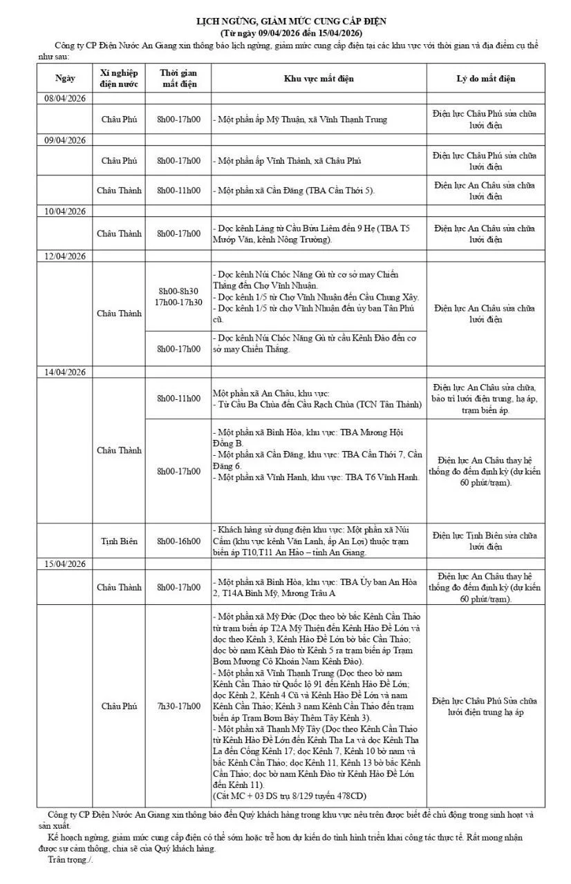 Thông báo lịch ngừng, giảm mức cung cấp điện (Từ ngày 09/04/2026 đến ngày 15/04/2026)