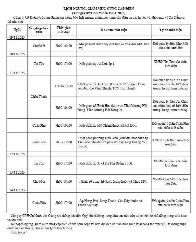 Thông báo lịch ngừng, giảm mức cung cấp điện (Từ ngày 09/11/2025 đến ngày 15/11/2025)
