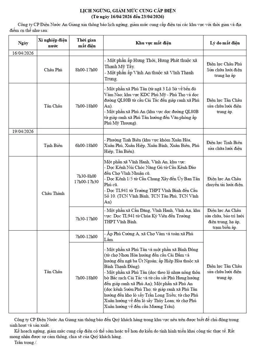 Thông báo lịch ngừng, giảm mức cung cấp điện (Từ ngày 16/04/2026 đến ngày 23/04/2026)