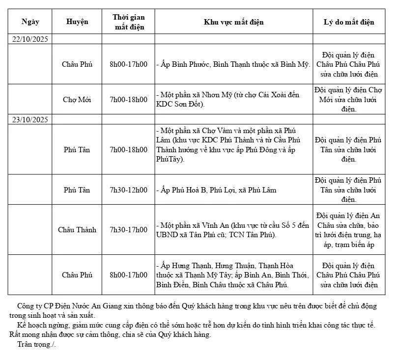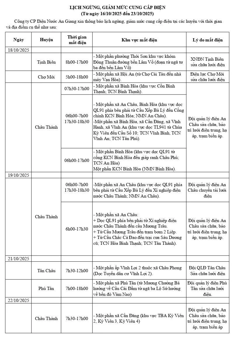 Thông báo lịch ngừng, giảm mức cung cấp điện (Từ ngày 16/10/2025 đến ngày 23/10/2025)