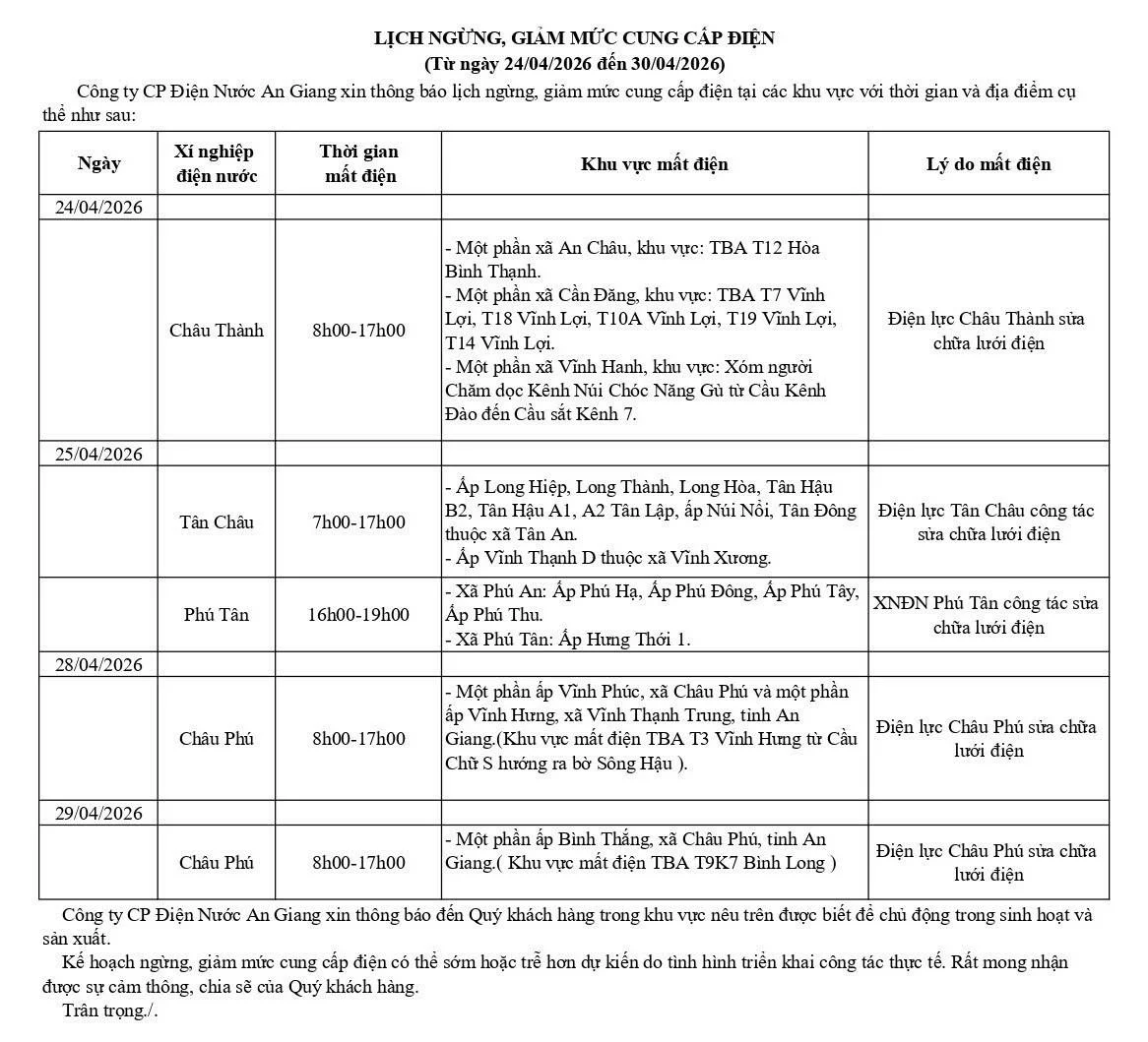 Thông báo lịch ngừng, giảm mức cung cấp điện (Từ ngày 24/04/2026 đến ngày 30/04/2026)