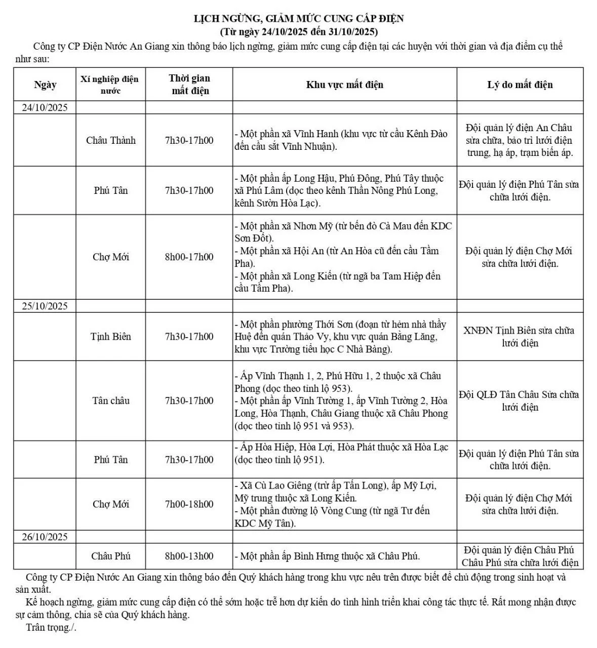 Thông báo lịch ngừng, giảm mức cung cấp điện (Từ ngày 24/10/2025 đến ngày 31/10/2025)
