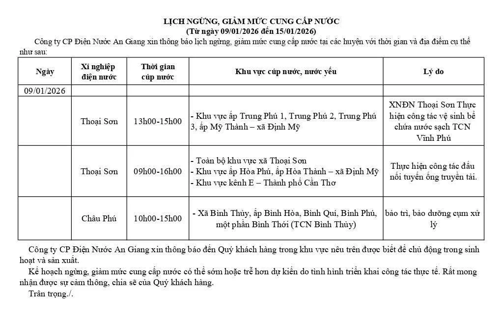 Thông báo lịch ngừng, giảm mức cung cấp nước (Từ ngày09/01/2026 đến ngày 15/01/2026)