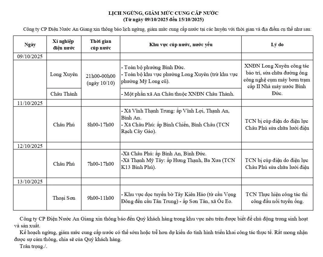 Thông báo lịch ngừng, giảm mức cung cấp nước (Từ ngày 09/10/2025 đến ngày 15/10/2025)