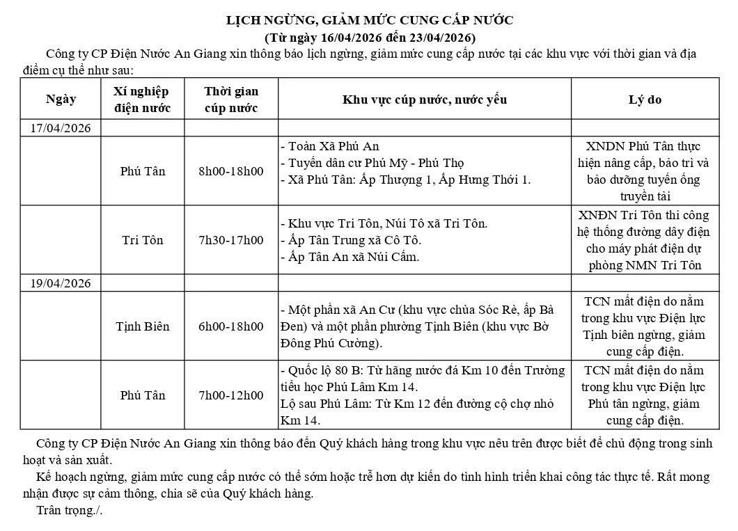 Thông báo lịch ngừng, giảm mức cung cấp nước (Từ ngày 16/04/2026 đến ngày 23/04/2026)