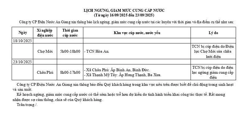 Thông báo lịch ngừng, giảm mức cung cấp nước (Từ ngày 16/10/2025 đến ngày 23/10/2025)