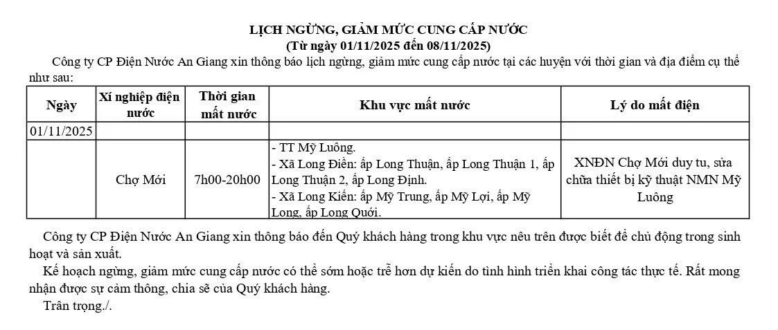 Thông báo lịch ngừng, giảm mức cung cấp nước (Từ ngày 01/11/2025 đến ngày 08/11/2025)