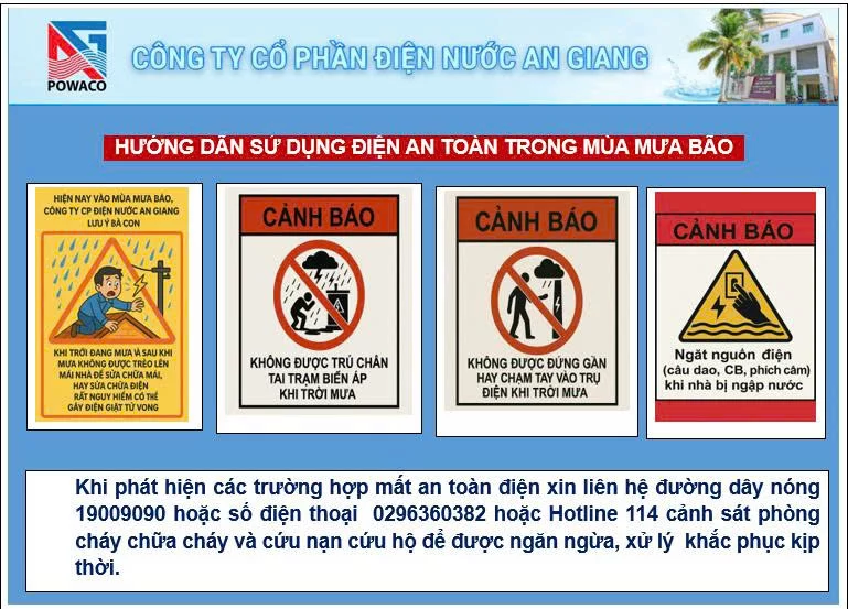 Hướng dẫn sử dụng điện an toàn trong mùa mưa bão https://diennuocag.com.vn/huong-dan-su-dung-dien-an-toan-trong-mua-mua-bao https://diennuocag.com.vn/huong-dan-su-dung-dien-an-toan-trong-mua-mua-bao#respond Mon, 03 Nov 2025 07:10:39 +0000 https://diennuocag.com.vn/?p=2214 Trong mùa mưa bão, Công ty Cổ phần Điện Nước An Giang khuyến cáo quý khách hàng nâng cao ý thức phòng tránh tai nạn điện. Không trú mưa, không đến gần cột điện, trạm biến áp hay dây điện bị đứt, và ngắt ngay nguồn điện khi khu vực bị ngập nước. Tuyệt đối không chạm vào hoặc tự sửa chữa thiết bị điện khi chưa đảm bảo an toàn. Khi phát hiện sự cố, hãy liên hệ 19009090, 0296.360.382 hoặc Hotline 114 để được hỗ trợ kịp thời. Chủ động phòng ngừa – an toàn cho bạn, gia đình và cộng đồng.