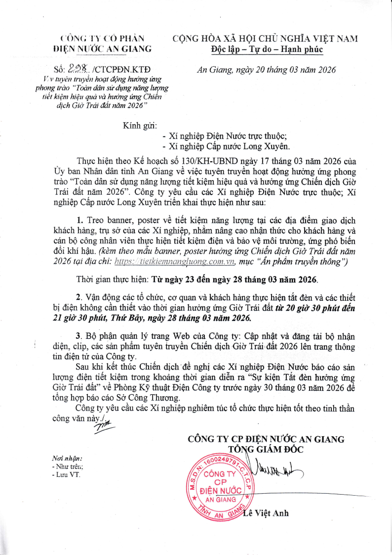 Công ty Cổ phần Điện Nước An Giang tuyên truyền hoạt động hưởng ứng phong trào “Toàn dân sử dụng năng lượng tiết kiệm hiệu quả và hưởng ứng Chiến dịch Giờ Trái đất năm 2026”