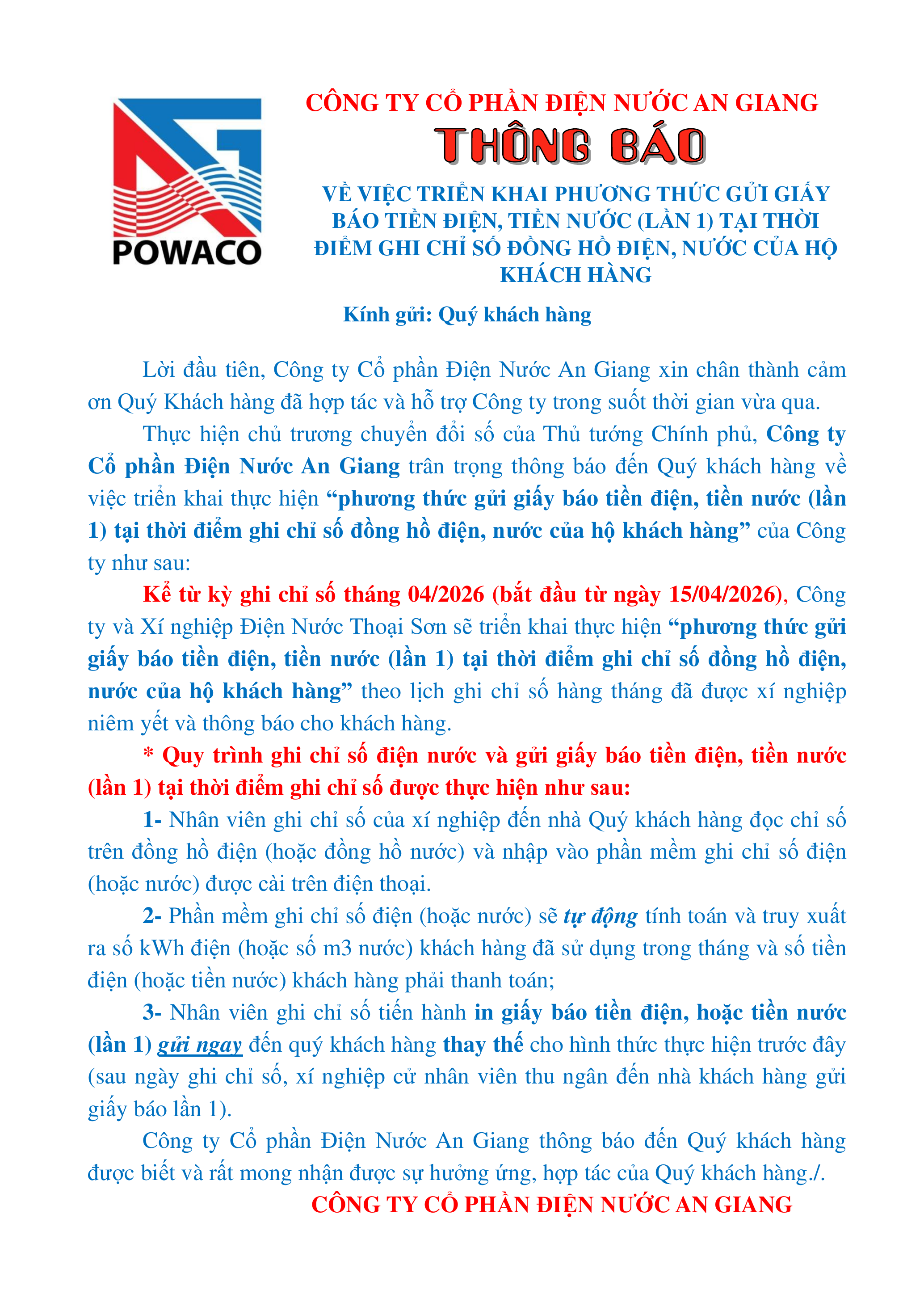 Thông báo về việc triển khai phương thức gửi giấy báo tiền điện, tiền nước (lần 1) trên địa bàn do Xí nghiệp Điện Nước Thoại Sơn quản lý 31/03/2026