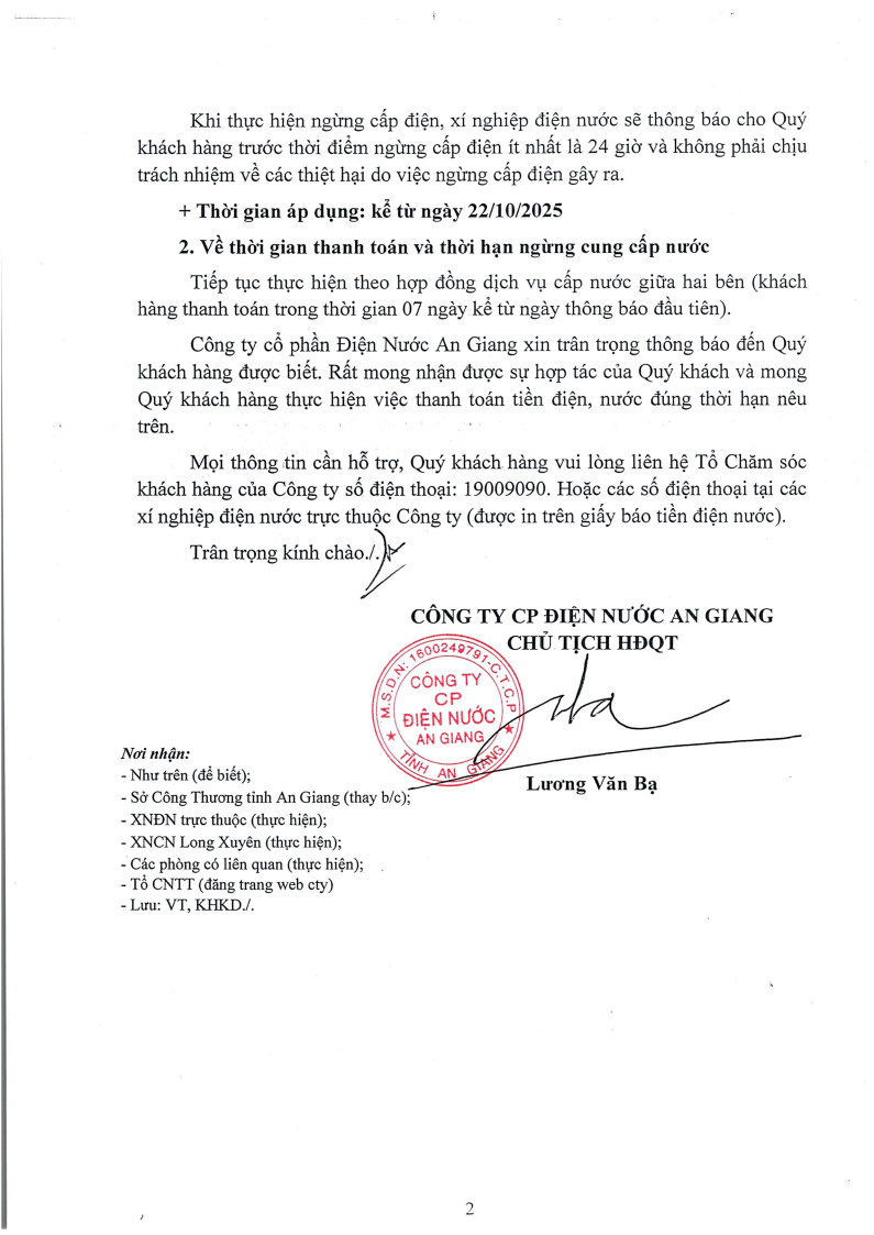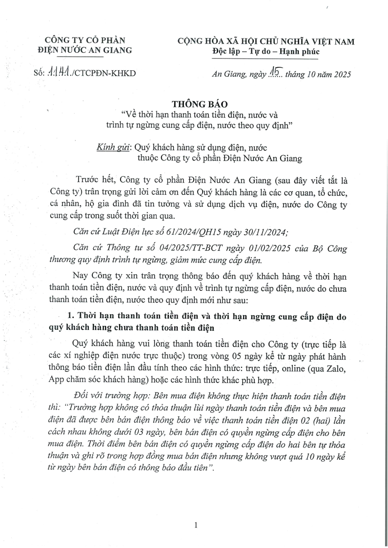 Thông báo về thời hạn thanh toán tiền điện, nước và trình tự ngừng cung cấp điện, nước